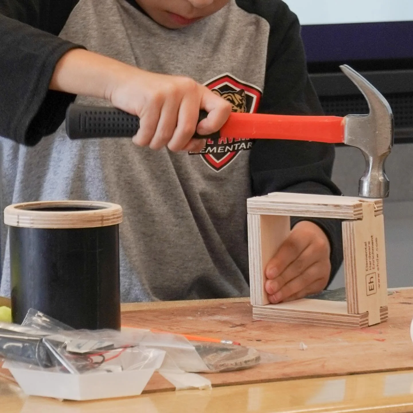 Students use hand tools to assemble basic woodworking & electrical DIY project kits.